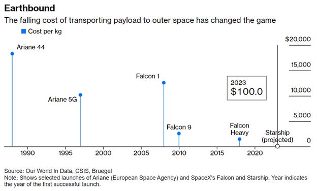SpaceX has basically a monopoly on launches now, and that includes Starlink satellites. The metric that the industry uses is cost per kilogram: how much does it cost to launch a kilogram of payload into orbit. And Falcon’s payload launch cost is dropping toward zero. This is reusable rockets, again, and a company organization at Space X with a very high level of vertical integration and manufacturing efficiency.