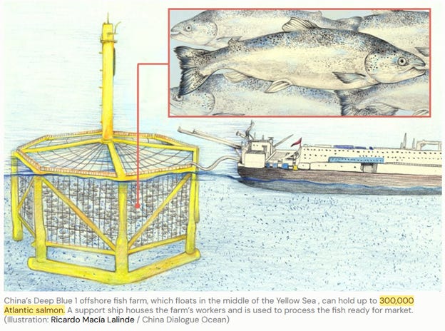 Chinese companies are also investing heavily in farming salmon, both onshore and off. This company uses giant octagonally shaped cages with room for 300,000 salmon, and the vessels will be much larger in the future. Stock density on for these offshore facilities is four to six times traditional net pens. Eventually they hope that offshore aquaculture in China will be more than 600,000 tons a year.