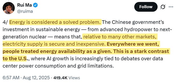 In the United States, power is the problem. But in China, power is not a problem. A group of top experts in AI came to China, looked around, and concluded that the race may already be over. Rui Ma runs TechBuzz China, but works in Silicon Valley full time. She came to a big tech conference in Shanghai, went home, and posted what her group saw on their trip to her X account. It is a long report, and here, in part 4—in China, energy is a solved problem.