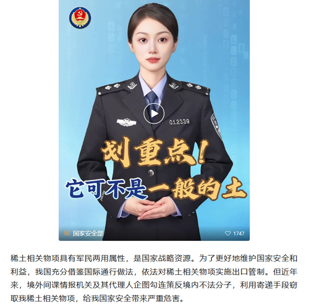 China’s intelligence agencies report that foreign intelligence services are organizing the illicit trafficking of the rare earths, which Beijing considers a strategic asset. This is the official post on Wechat, and the English for the first paragraph.
