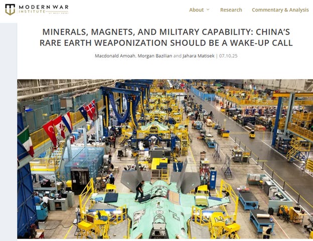 The Pentagon and weapons contractors are wide awake now, on the rare earth metals problem. China has monopolies over the refining and processing of the rare earth metals crucial for building advanced weapons. And there is a perfect storm on the demand side, as the Israeli Defense Forces and Ukraine are burning through NATO and US stockpiles of those advanced weapons.