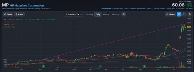 The company will invest the Pentagon money into building a facility that makes magnets, with the hope that it’s producing by 2028, and the Pentagon will buy all the magnets produced for the next ten years, at a minimum price of $110 per kilogram. MP Materials stock took off, more than tripling since the beginning of the year: