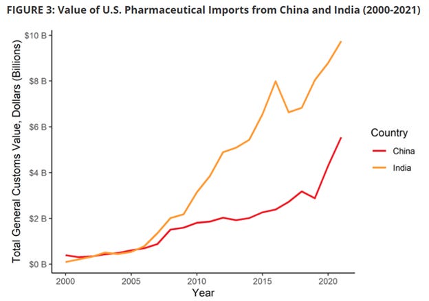 This results in low margins for Indian drugmakers. This analyst on Substack points out that Singapore is a tiny country, and Singapore doesn’t show up on this chart, at all, for drug exports to the US by weight, but Singaporean companies earn more money in the United States than India does. The obvious solution for India is to move down the value chain, in the same way Chinese companies did for antibiotics.