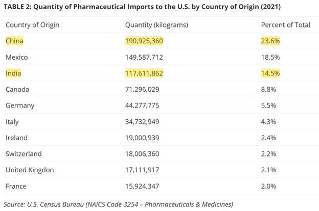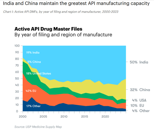 That, ironically, represents a huge opportunity for India and China. They already enjoy huge market share for the API’s, and the generics—which are the highest by volume. Over 40% of all drugs coming into the United States are inbound either China or India.