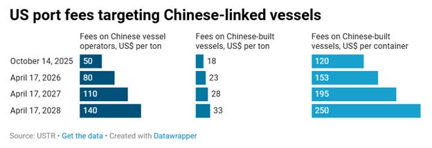 Again, that is hundreds of millions of dollars for each of these shipping companies, but it works out to only $120 a year per American. So if this all seems like a lot of trouble, given that they can just pass along these costs to importers and keep almost everything the same, there are two problems. In six months, April 2026, fees are going a lot higher, across the board. Then again the following April, and then again in 2028: