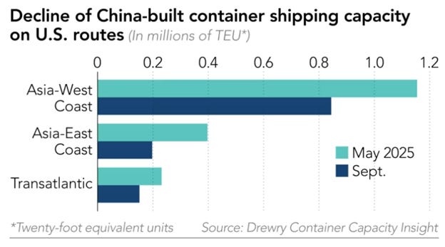 As they and other companies shift global trade patterns to get away from those high fees, shipments to the US will be slowed down, and supply chains restructured. Changes are already well underway, as companies from countries elsewhere are coordinating shipments closely, and we see a sizable reduction in US-built ships making US port visits: