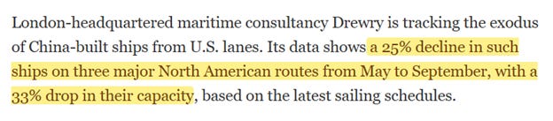 Premier Alliance is comprised of three companies from South Korea, Japan, and Taiwan, and so the problem for them, obviously, is that they’ve got a bunch of ships – ten -- built in Mainland China that are subject to the high port fees. So those particular ships will move, to serve other markets. We should assume that Premier Alliance was using those Chinese ships for US ports on the West Coast because it was most efficient to do it that way. More economical, and faster. We should also assume that their new supply chain will be less economical and less fast, less stable, for buyers of imported goods heading to the United States. Capacity shortages are likely, especially during the busiest times. There’s no getting around the higher cost problem, for American consumers, which will be $30 billion a year.