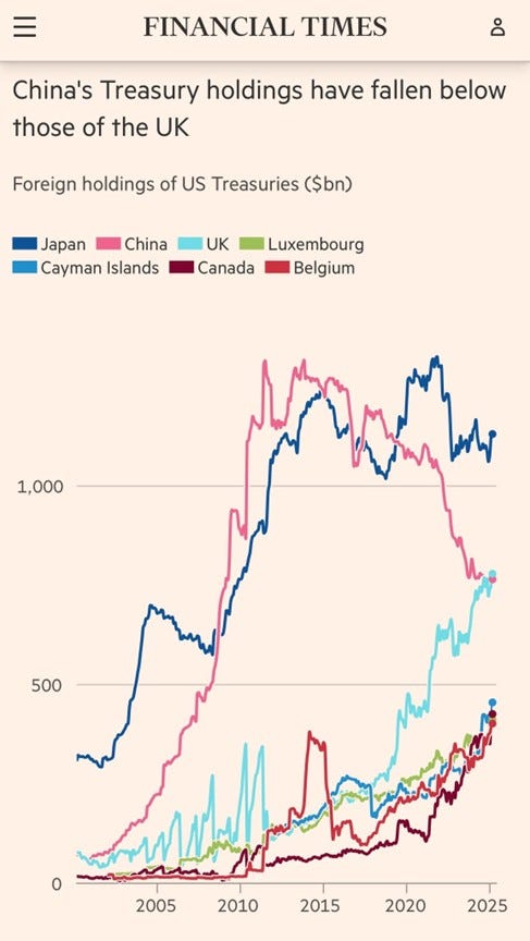 Researchers from this bank, the Bank of China, published a report of their recommendations, to the People’s Bank of China and to other regulators here. They want to reduce even further their exposure to US dollars. The national debt in the United States keeps going higher, setting records. US Treasury bonds aren’t in default, technically, yet, but things cannot keep going the way they are without something breaking. The American economy cannot outgrow the problem—debt is rising far faster than any growth anyone thinks we’ll see. The certainty of rising US debt and trade deficits, and the uncertainty of tariff rules have resulted in a crisis of credibility. So these executives at the Bank of China are calling for more selling of US Treasuries, and for more buying of gold and other commodities.