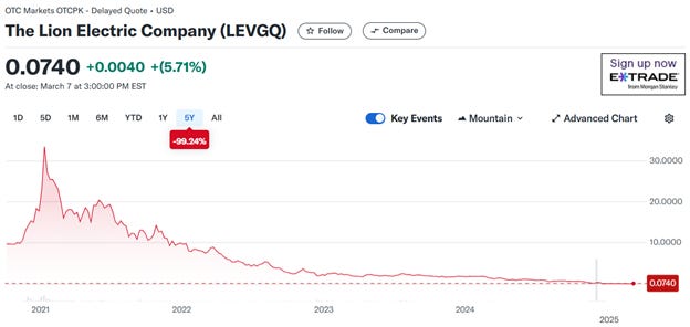 Since 2020, net losses at lion were $301 million dollars, the stock price has gone to zero, basically. Lion Electric is now trading on the OTC pink sheets, and it’s in bankruptcy. When you see a ticker symbol with a Q in the last position, it means the company is in bankruptcy, but the stock is still trading. Last March, an investor group filed a class action suit against Lion, saying that the company wasn’t forthcoming about supply chain problems and grossly unrealistic financial projections,