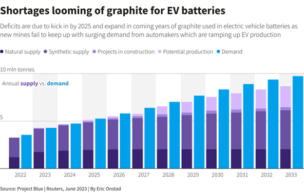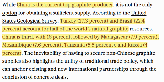 Graphite is a key material to build the batteries for electric vehicles, and China’s export ban on graphite was targeted against carmakers outside China. So supply chain guys start looking for alternative sources, given that China is the world’s top producer of graphite.